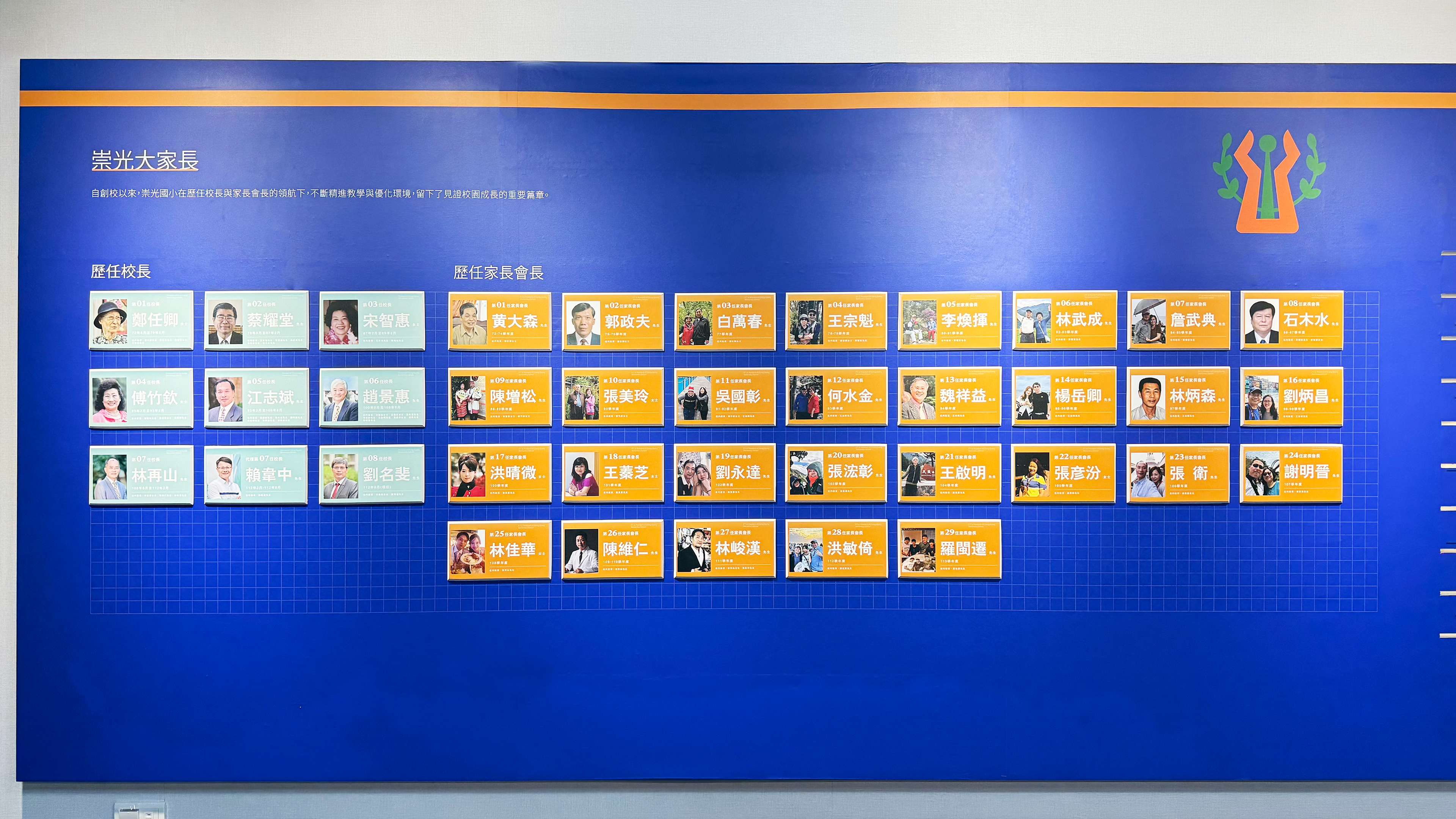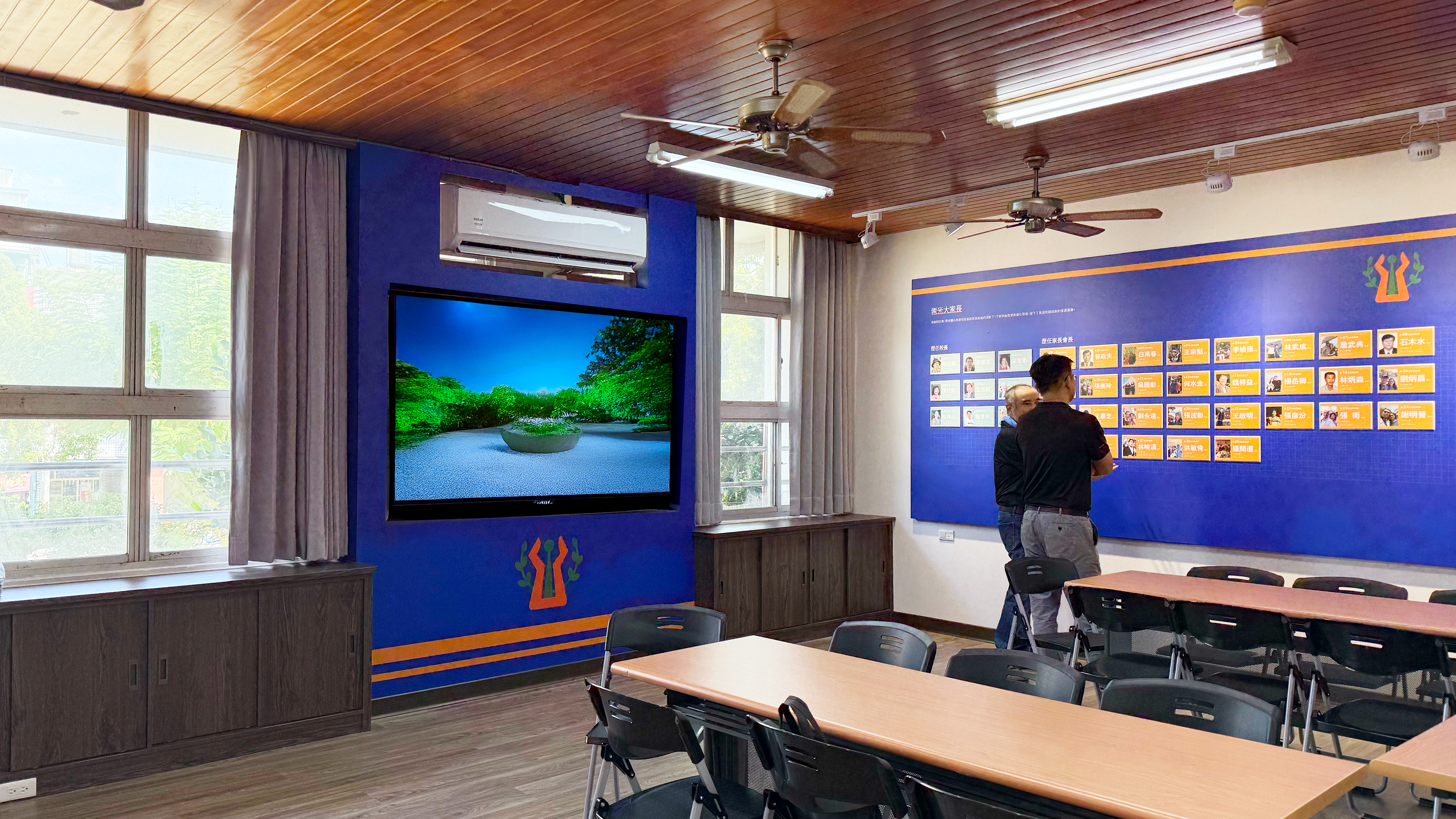 牆面整合媒體展示機能,內嵌 75 吋螢幕,兼顧會議使用與校史影像播放;窗台上方則規劃為開放式展示平台,陳列歷年重要獎盃與榮譽。左右兩側分別設置「崇光大家長」與「我們的卓越傳承」主題區,呈現歷任校長、家長會長與各項獲獎紀錄,並透過具彈性的展示溝槽系統,回應不同展示形式的長期使用需求。