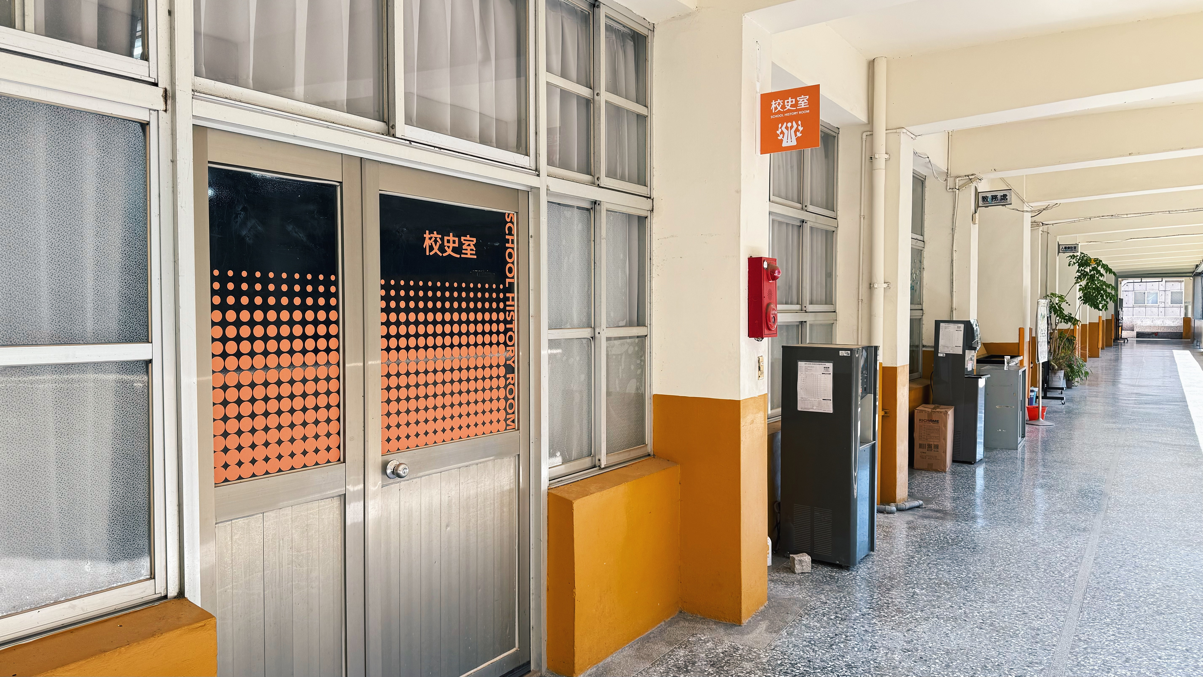 校史室的入口意象,被設定為如同精緻餐飲中的「開胃菜」,以橘色主調貫穿設計,取代原有不透明玻貼與舊式招牌,引導觀者產生好奇並走入空間。