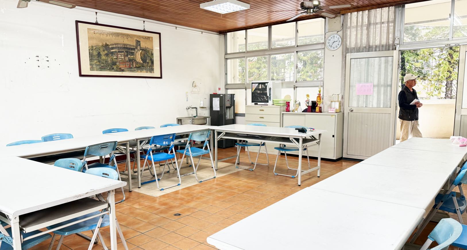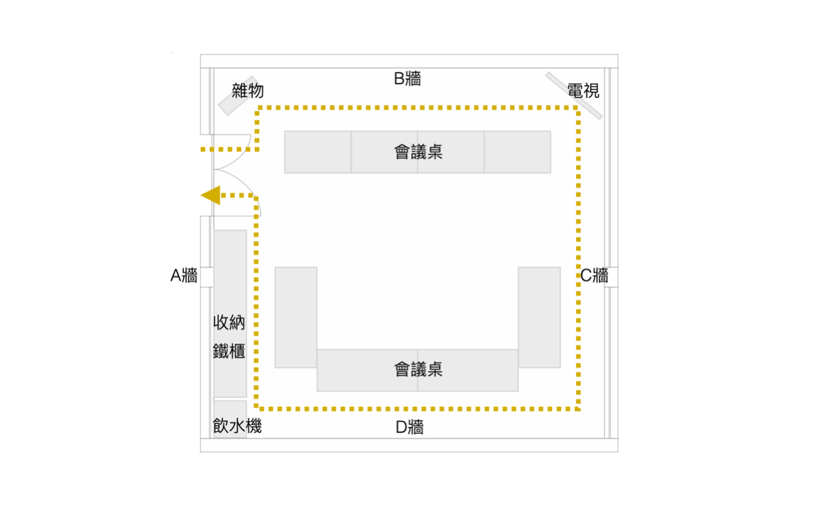 空間為單一出入口的方形格局,中央配置口字型桌椅,長期作為會議與行政使用。由於家具配置固定且佔據空間核心,動線僅能沿桌邊繞行,不利於彈性使用與多元活動的發生。