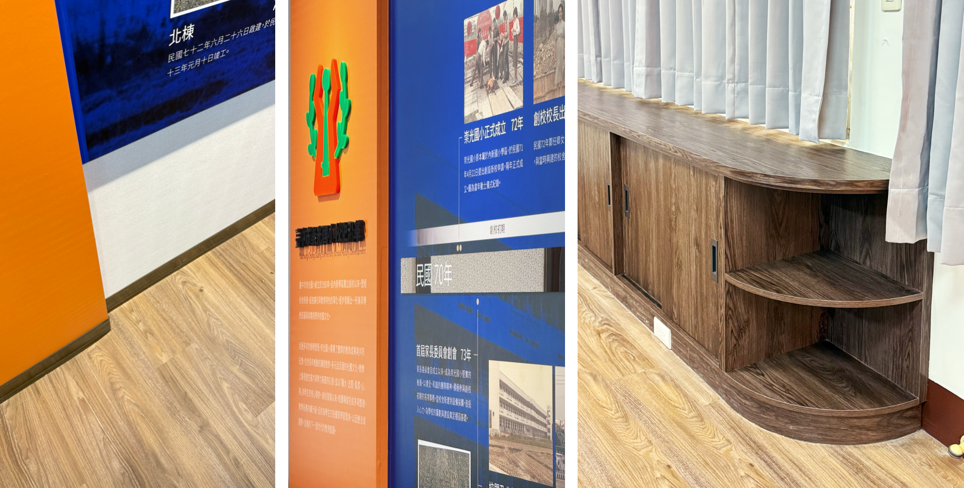 專案不只是牆面與校史展示的規劃設計呈現,更細膩處理各種空間細節,如牆面展示的深淺錯落,以及地板鋪面、收納空間與遮光的重新整理。